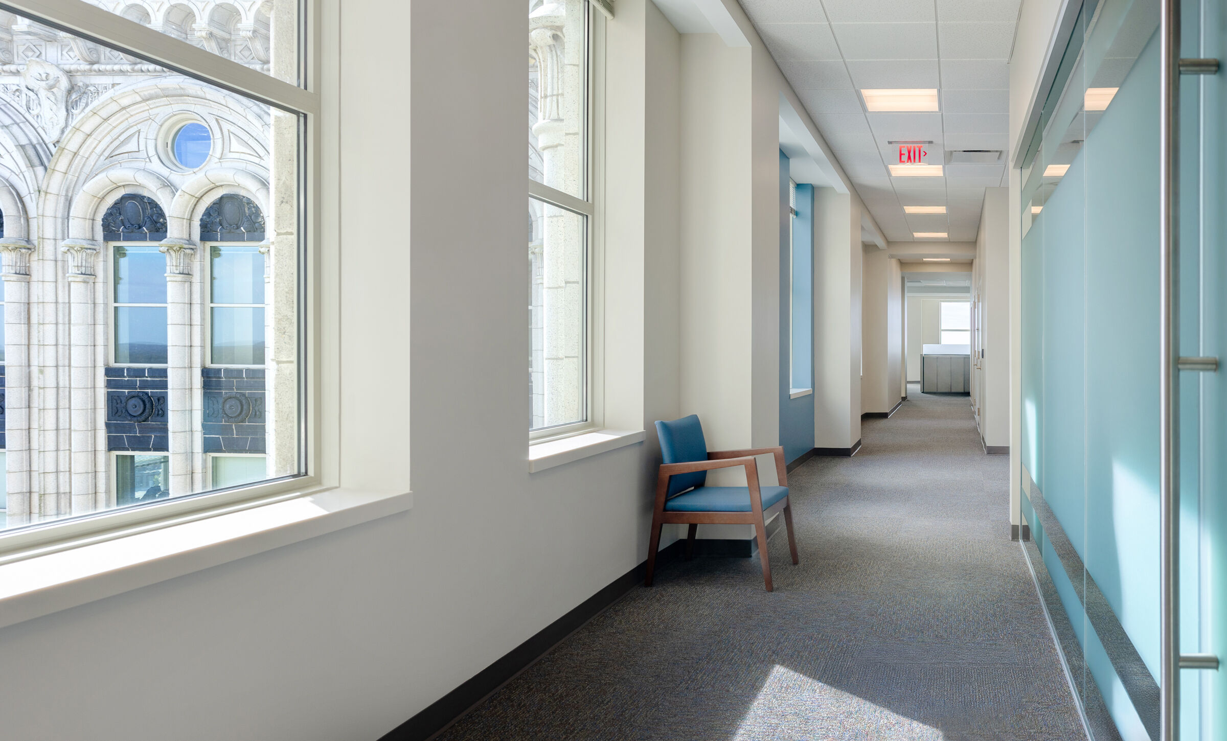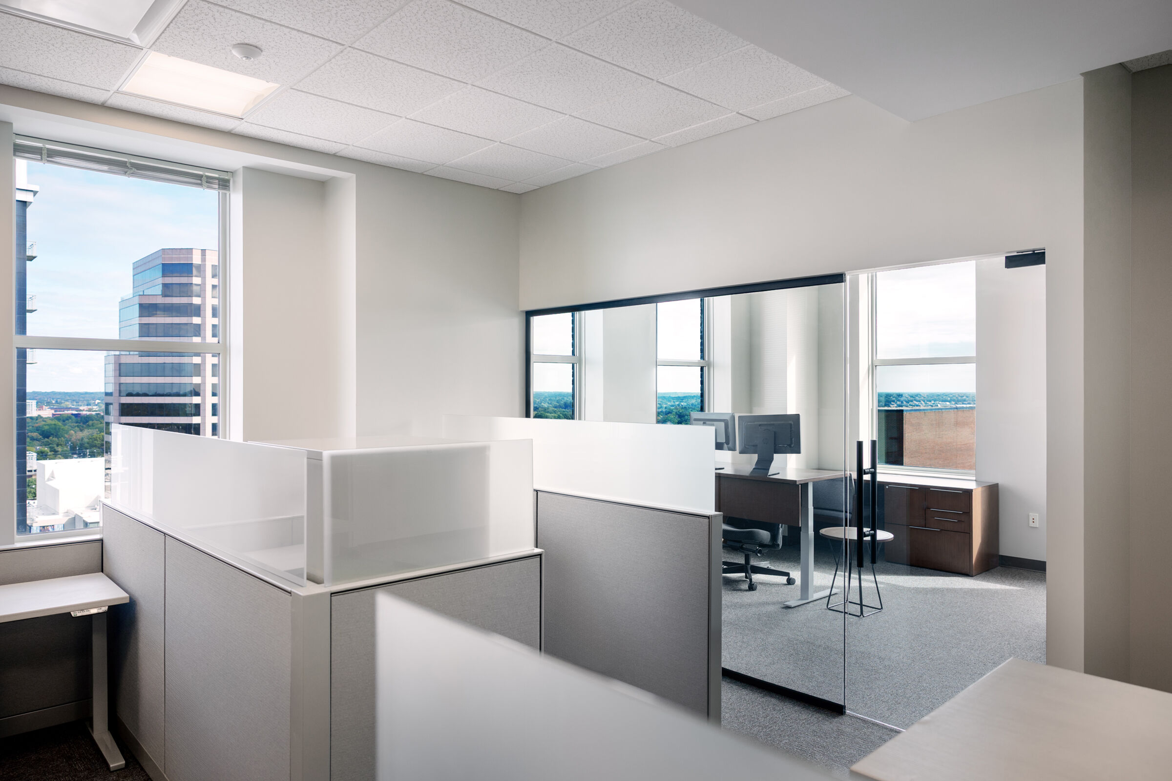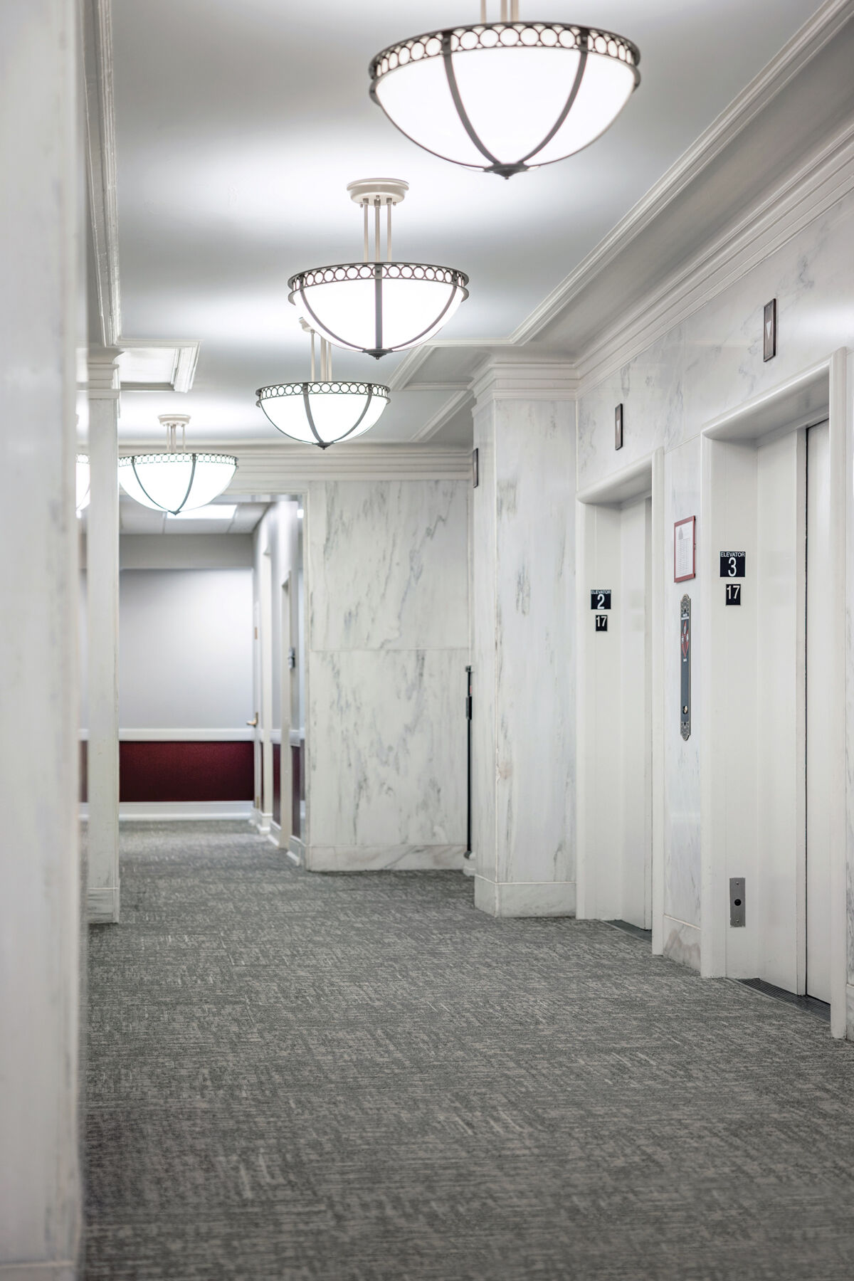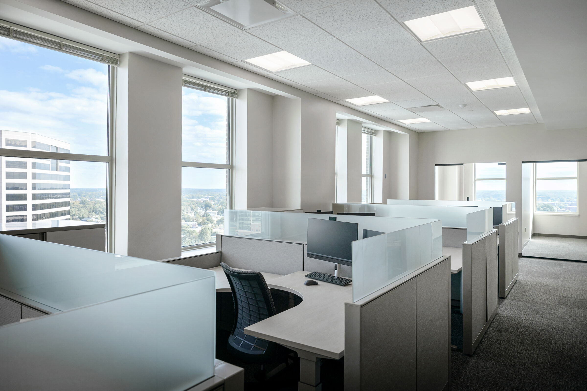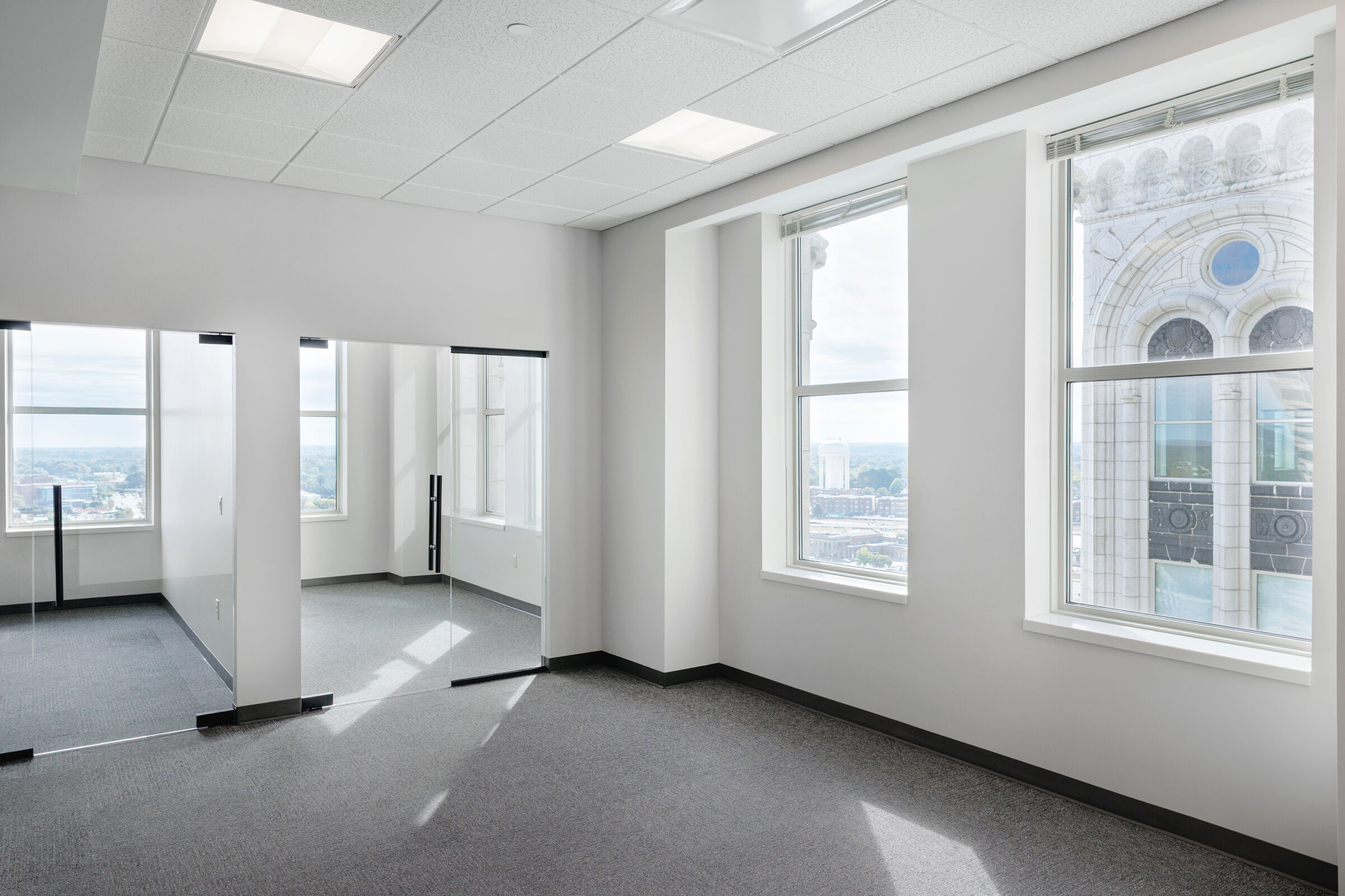 Renovation of four floors within the historic 18-story Jefferson Standard Building, featuring upgrades to open office areas, private offices, elevator lobbies, and mechanical spaces.